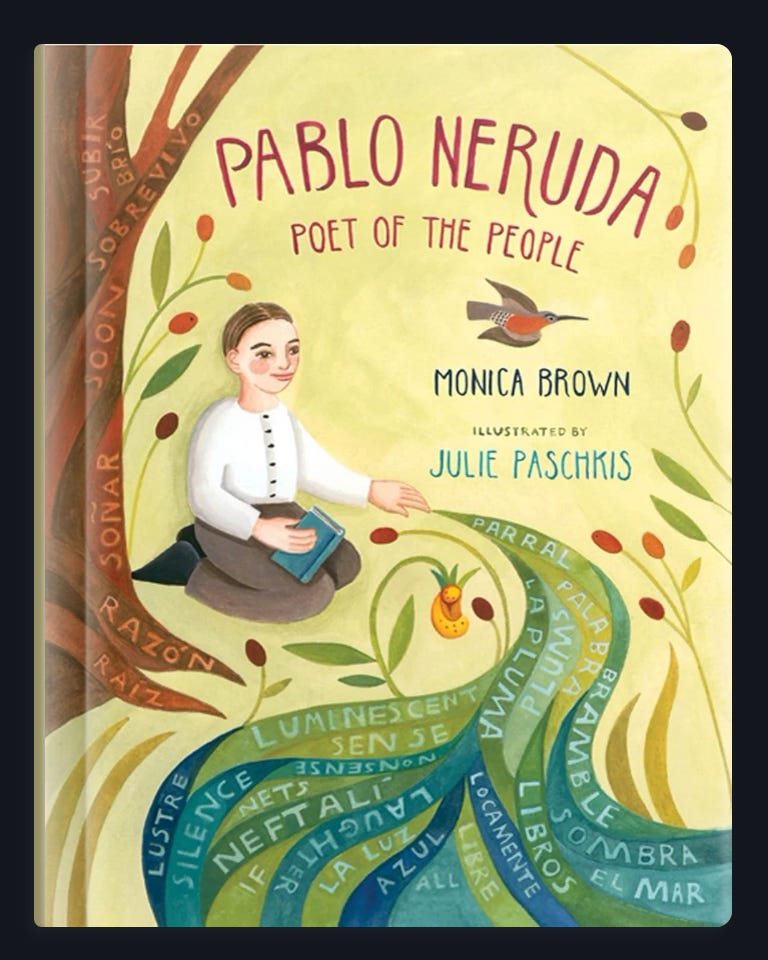 As I settled in, I realized I needed the Wi-Fi password. On my way to the shelves where the password was, I spotted a small collection of children’s books tucked on a nearby shelf. One caught my eye: Pablo Neruda — Poet of the People.